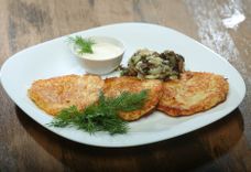 360/3 г • картофельные драники, свинина, грибы, сметана, петрушка, лук