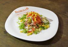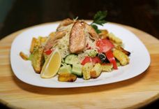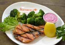 240/20/2 г • салат зеленый, семга, помидоры, сухарики, соус-майонез «фирменный», петрушка, , чеснок, лимон, сыр «Джугас», огурцы