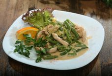 345/10/2 г • филе куриное, апельсины, соус «соевый», сливки, фасоль стручковая, чеснок, салат зеленый, петрушка